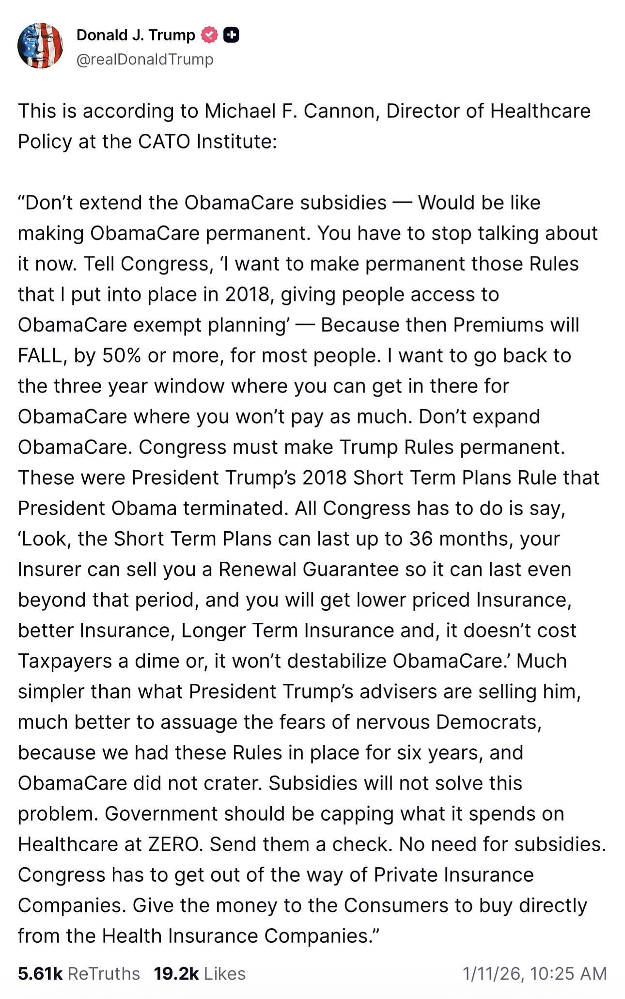 President Trump graciously posted to Truth Social about what would provide relief from soaring Obamacare premiums—and what would not.